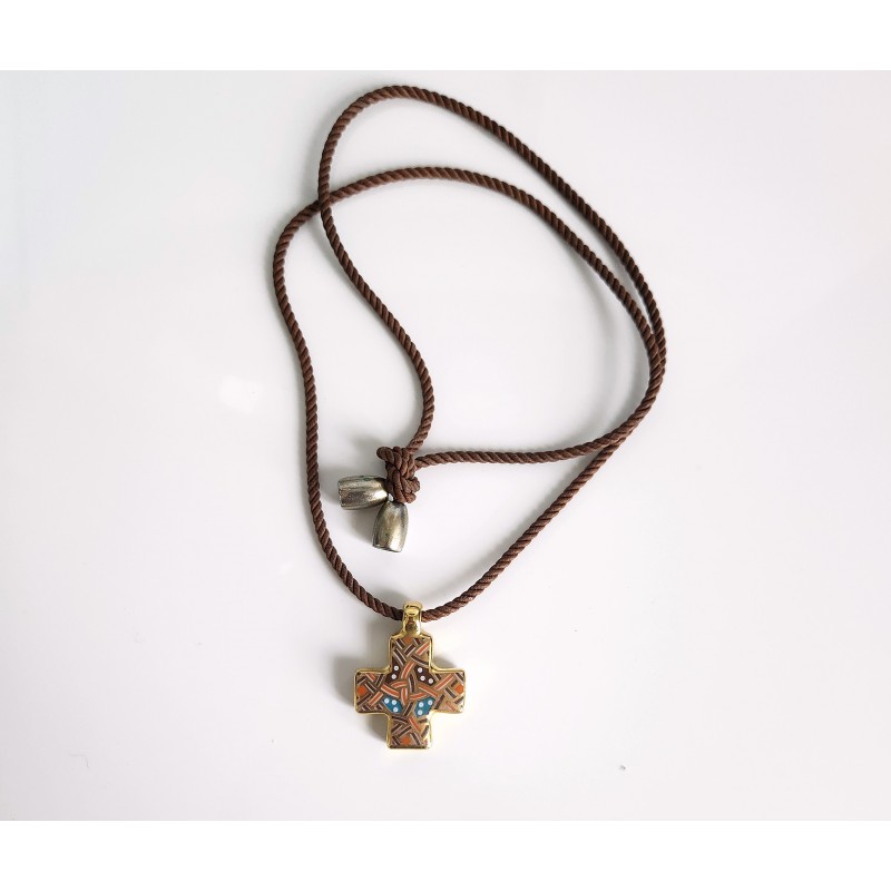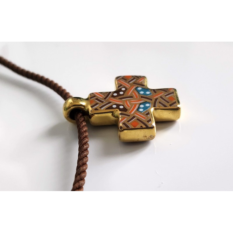 Jolie croix de la maison Bernardaud en porcelaine à fond doré et motifs entrecroisées multicolores. Largeur 24 mm, hauteur avec la bélière 31 mm, épaisseur 5 mm. Avec son cordon tréssé marron, de longueur réglable, longueur maximum 55 cm. Etat impeccable.