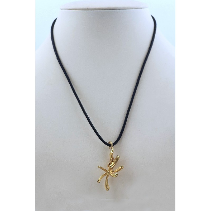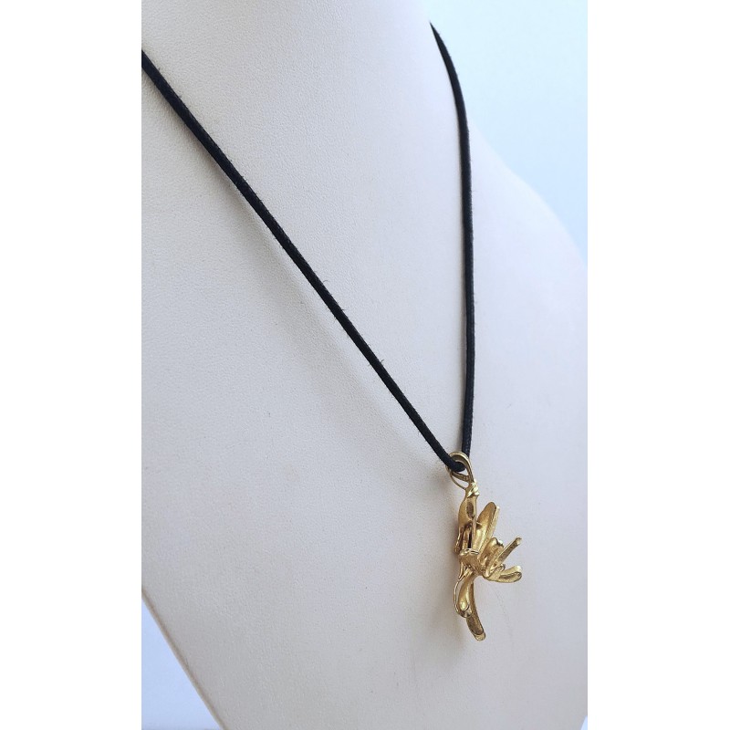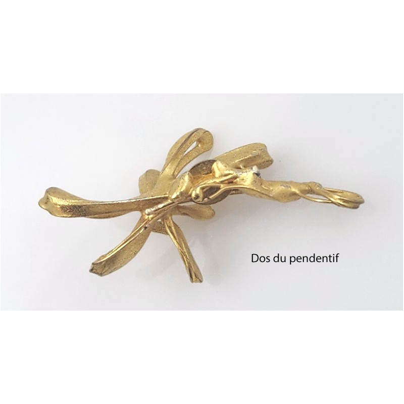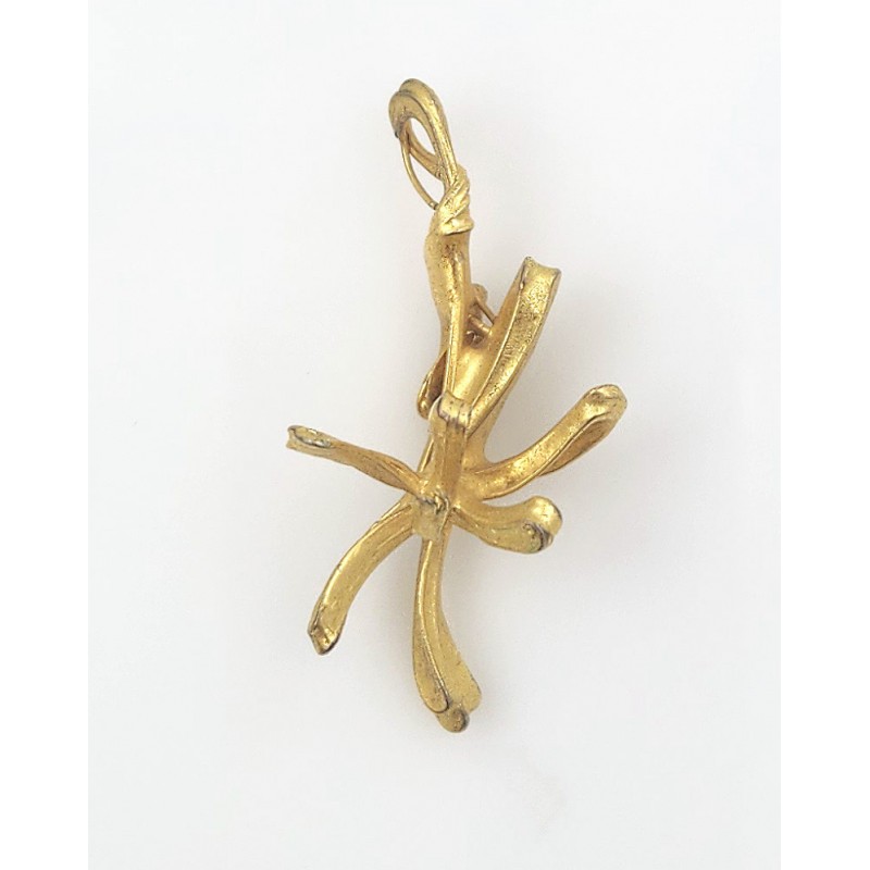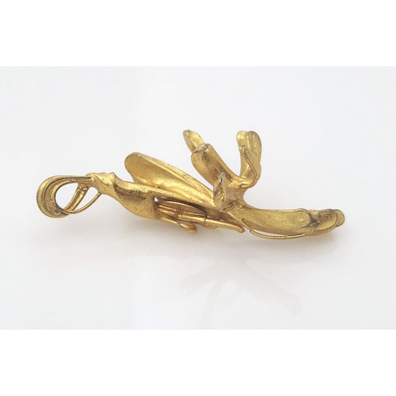 Bijou du créateur-artisan Jacque d'Aubres, atelier à Vezelay dans les années 1950/70. Ses bijoux étaient plaqués d'or dans un atelier parisien après leur fabrication artisanale. Ici, il s'agissait d'une broche qui présentait le motif floral horizontalement. L'épingle qui fermait la broche a simplement été enlevée, sans autre changement, pour en faire un pendentif original, qui se porte facilement, qui bouge avec les mouvements mais revient en place et qui ne s'accroche pas aux vêtements. Dimensions 46 x 25 mm, poids 7,50 grammes.