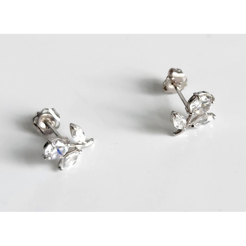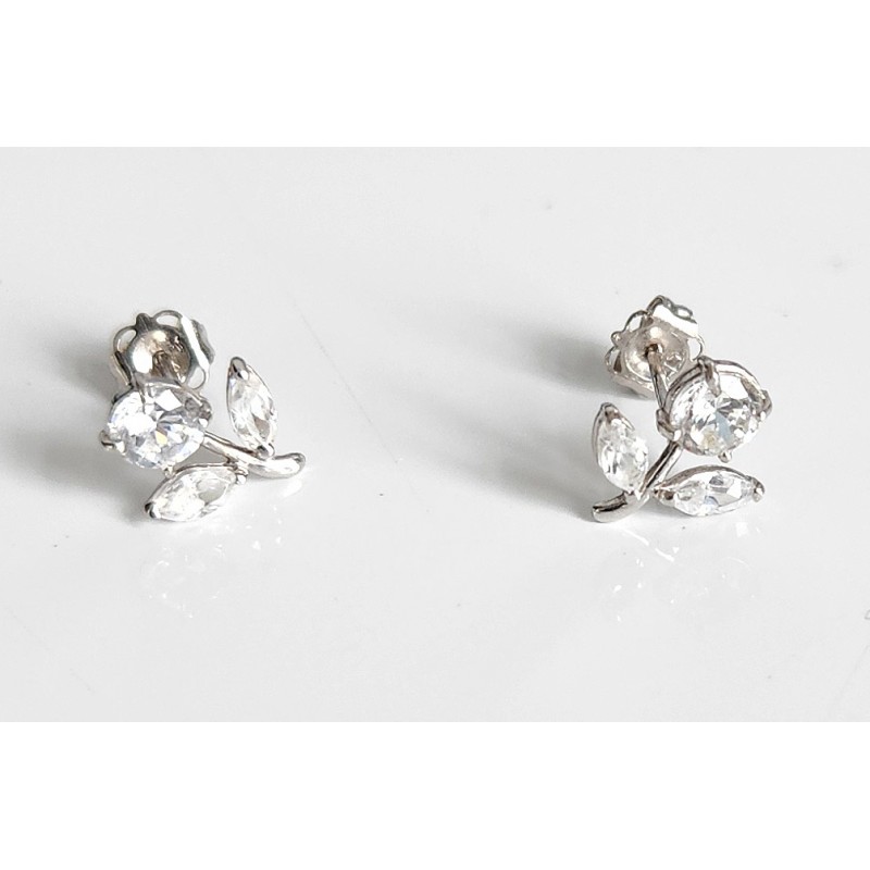 Jolies boucles d'oreilles en or blanc 18 carats, poinçon 18 K, c'est un poinçon étranger, l'or a été testé, je le garantis en 18 carats. Elles sont ornées de fleurs montées sur griffes et faites de trois pierres blanches brillantes, ce sont des oxydes de zieconium. Dimensions sur l'oreille 9 x 9 mm, poids 0,78 gramme. Etat impeccable.