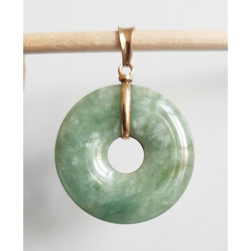 Pendentif en jadéite naturelle, de couleur vert pâle moucheté, la monture est en or 18 carats, non poinçonne mais testé et garanti en 18 carats. Diamètre 25mm, épaisseur 4 mm, poids 6,05 grammes. Etat impeccable.